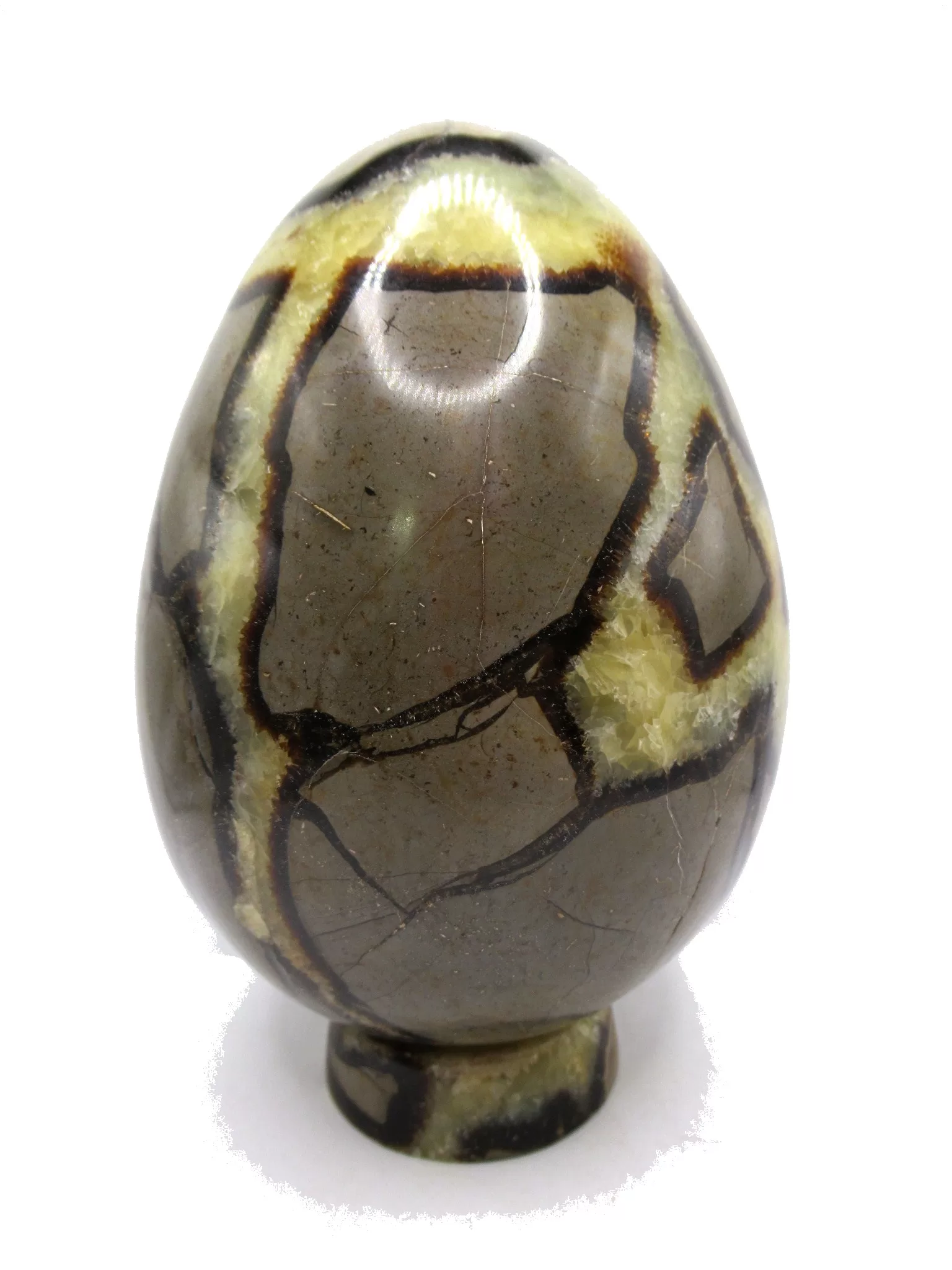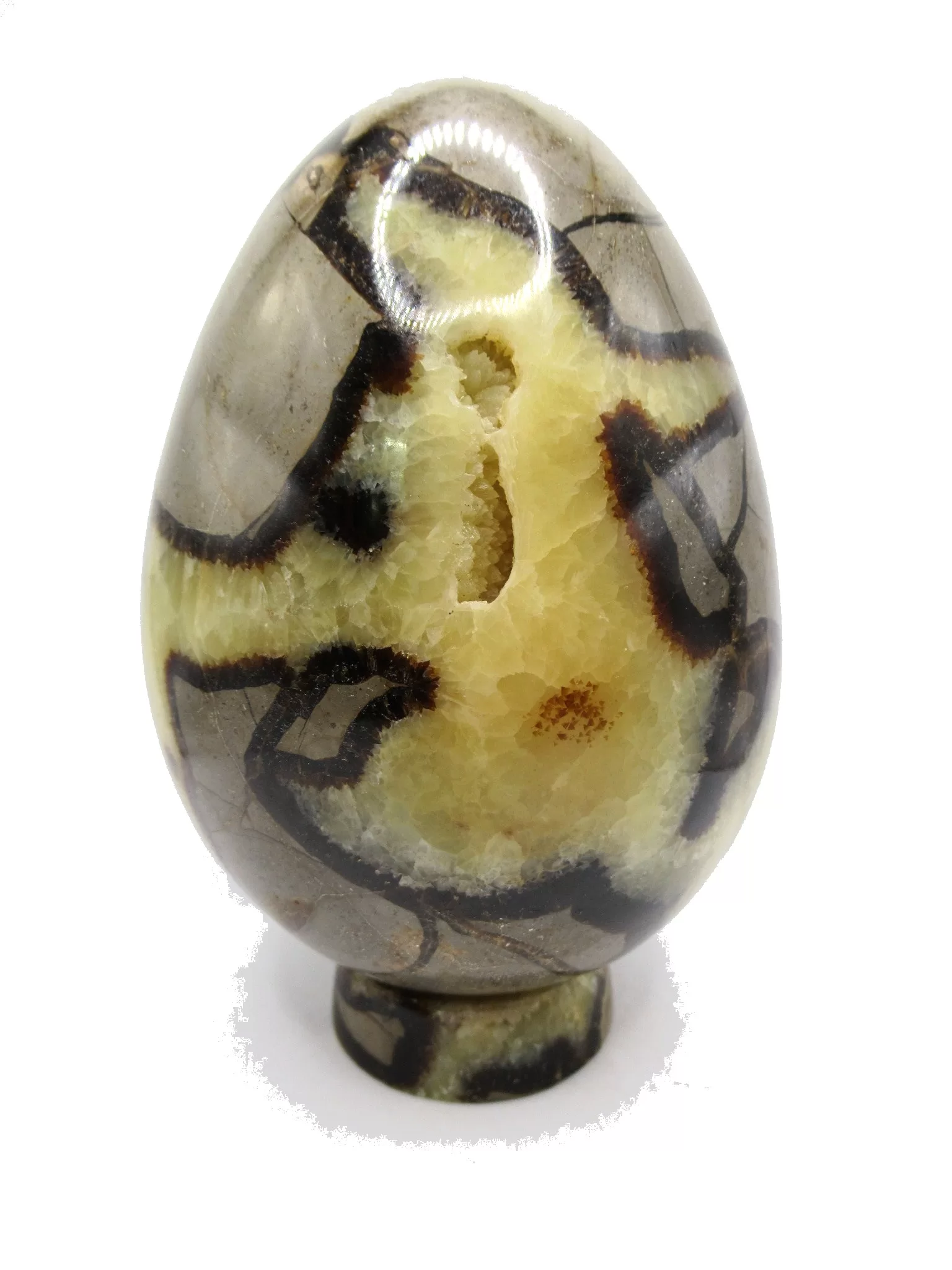 This meticulously shaped and hand polished egg shows the beautiful yellow calcite, brown aragonite, and grey to brown limestone. The specimen comes with a carved base made from the same material and allows the egg to sit for a solid display.