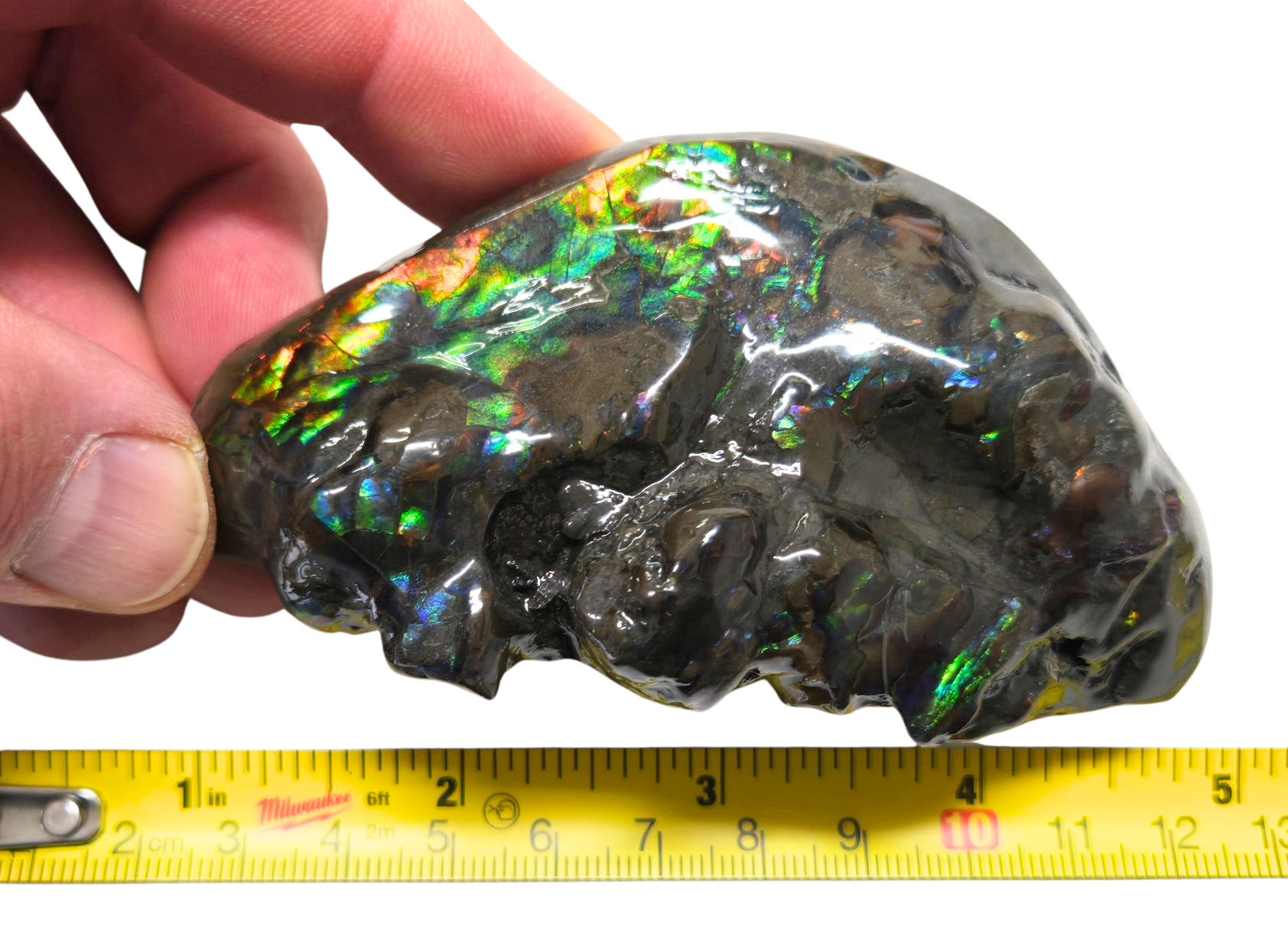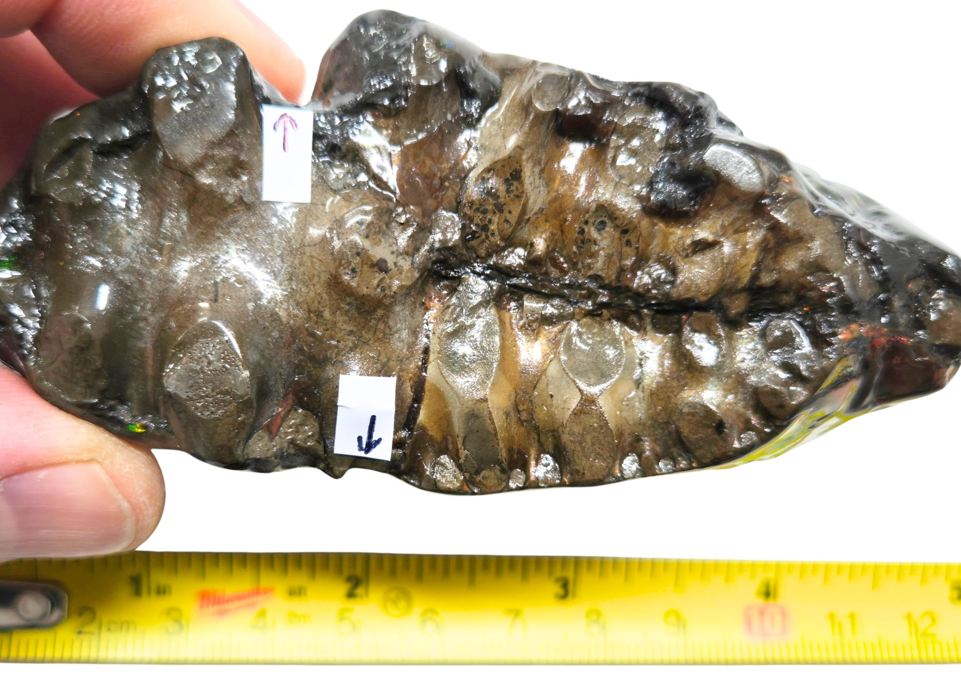 - Placenticeras costatum. This Gem Ammolite Hand Specimen Measures approximately 4” x 1 ¾” x 2” tall. Very rich colors on one side. The second has flashes. Three bitemarks in total. Two on first side and one on the second side. For the two bites on the bottom of the piece, I put arrows where their location is as seen in photo This specimen will include a Certificate of Authenticity as well as an identification Label.