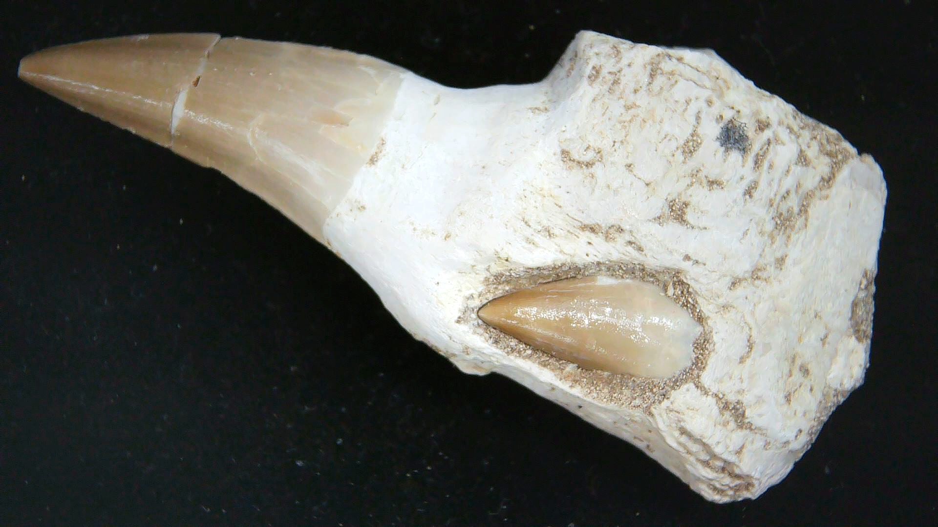 - The rooted specimen measures 2.65“ long and has the replacement tooth visible in the root.  (There has been a crack glued)