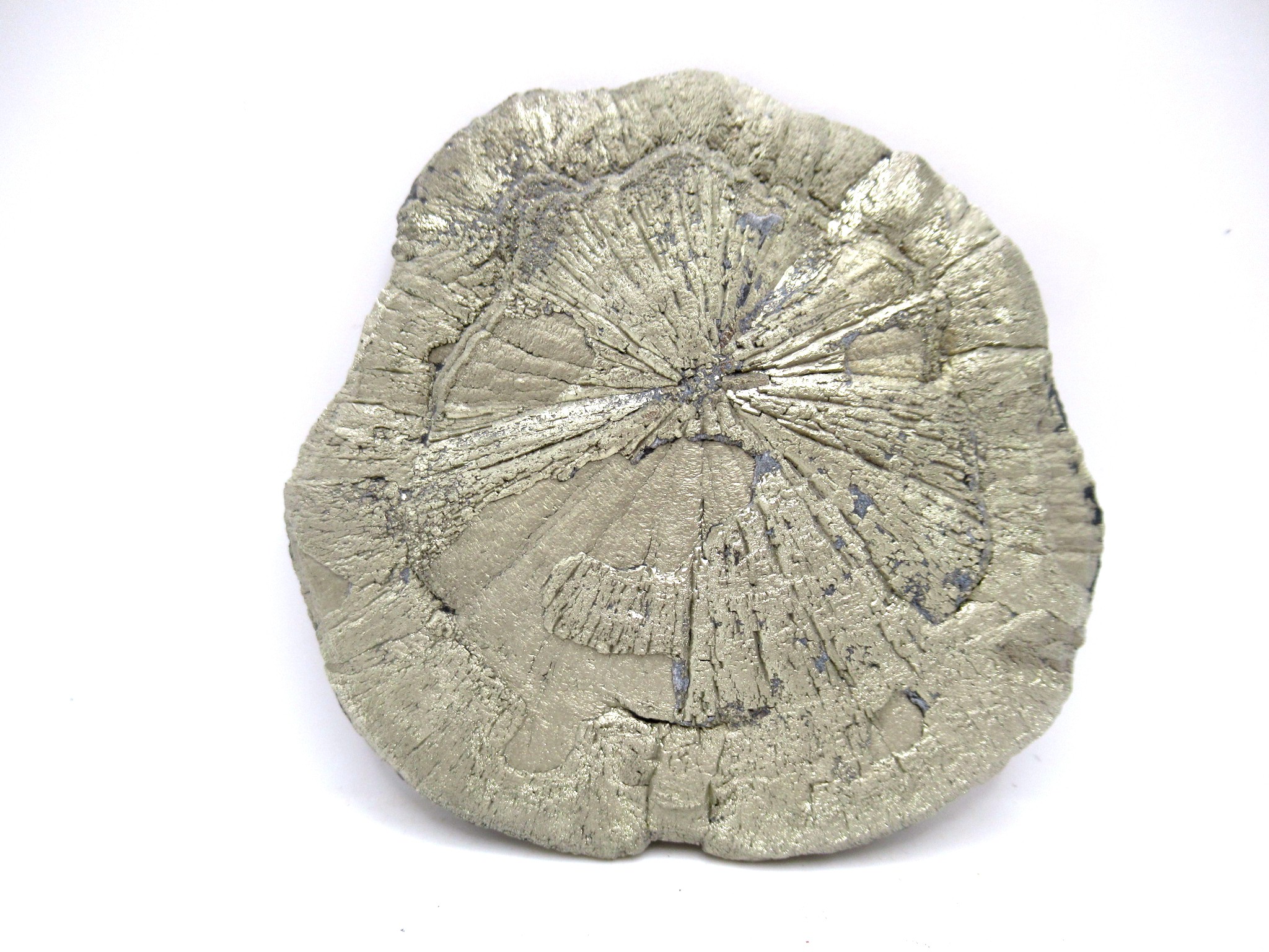 They may look similarly like fossilized plants, but the crystal structures actually formed deep underground and also under great pressure about 350 million years ago. These round disks sometimes occur between seams of coal and may be found when coal is mined. Although pyrite is quite common worldwide, the disk form is virtually unique to Illinois.