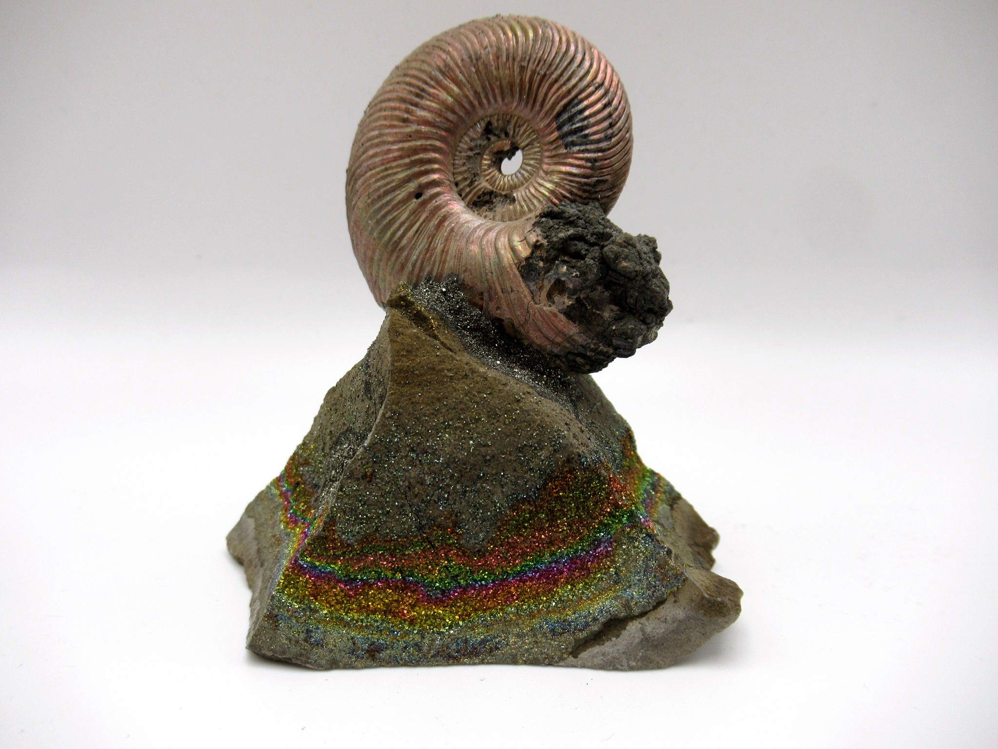 • This is a natural pyritized ammonite.  In this case it was mounted on a fragment of argyllite septarian stone.  In addition the septarian is covered with pyrite.
