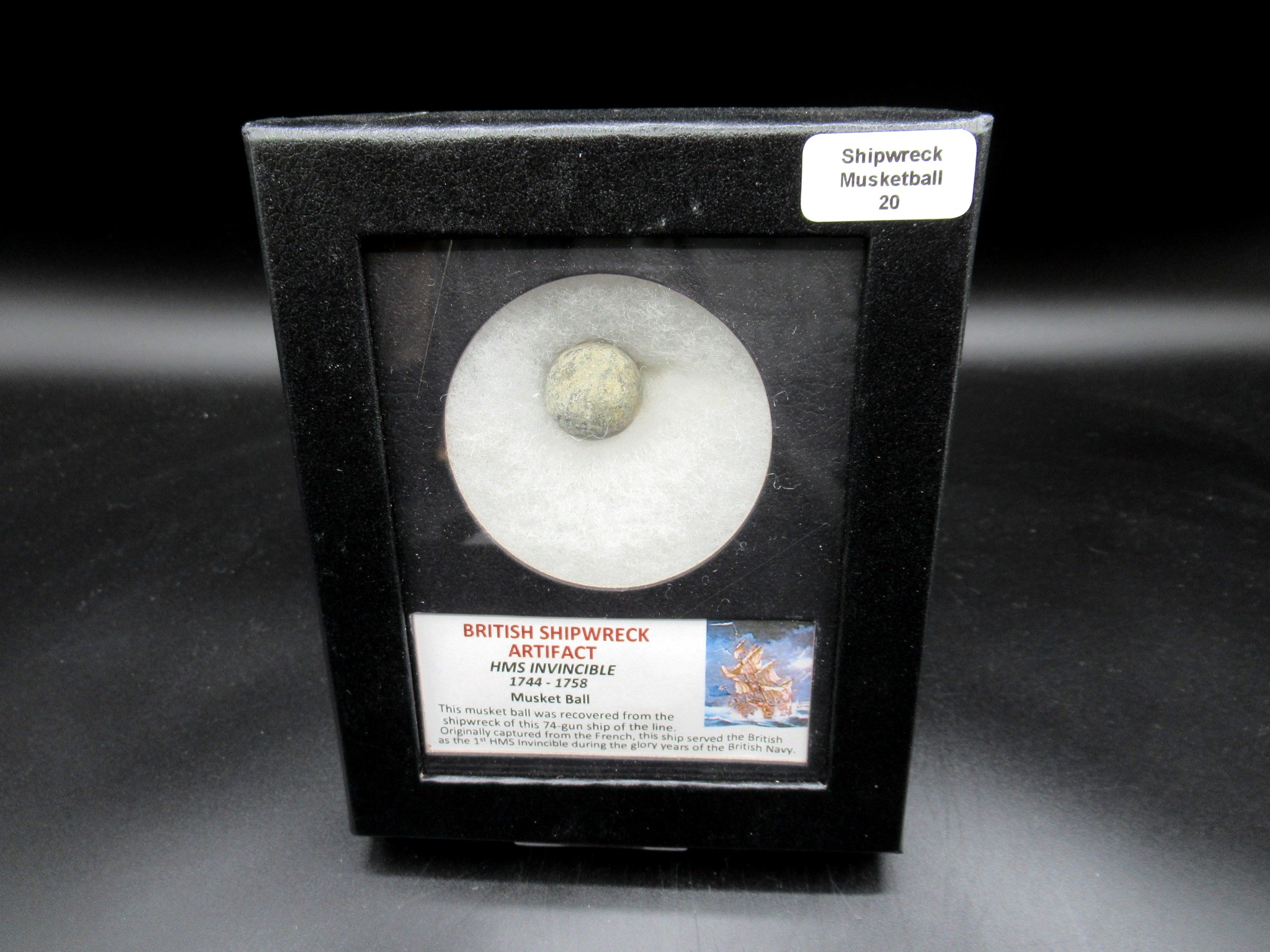 • This specimen is a musket ball that was recovered during salvage operations.  The specimen is housed within a  nicely displayed within a Mat with a Label.  The whole display comes in a 4.25″ x 5.25″ Riker Mount as shown.  This musket ball was recovered from the shipwreck of this 74 gun ship of the line. Originally captured from the French, this ship served the British as the 1st HMS Invincible during the glory years of the British Navy. .