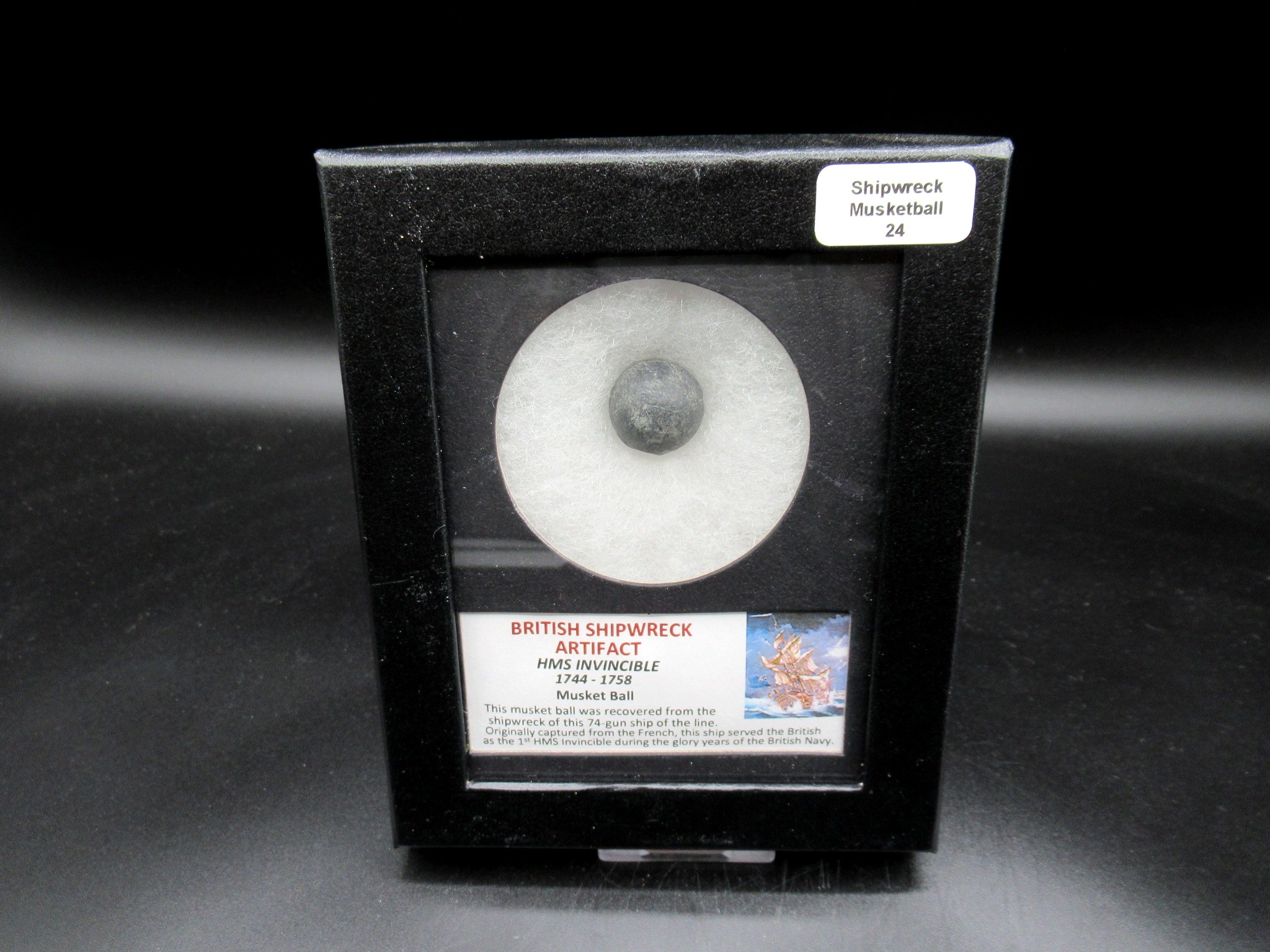 • This specimen is a musket ball that was recovered during salvage operations.  The specimen is housed within a  nicely displayed within a Mat with a Label.  The whole display comes in a 4.25″ x 5.25″ Riker Mount as shown.  This musket ball was recovered from the shipwreck of this 74 gun ship of the line. Originally captured from the French, this ship served the British as the 1st HMS Invincible during the glory years of the British Navy. .