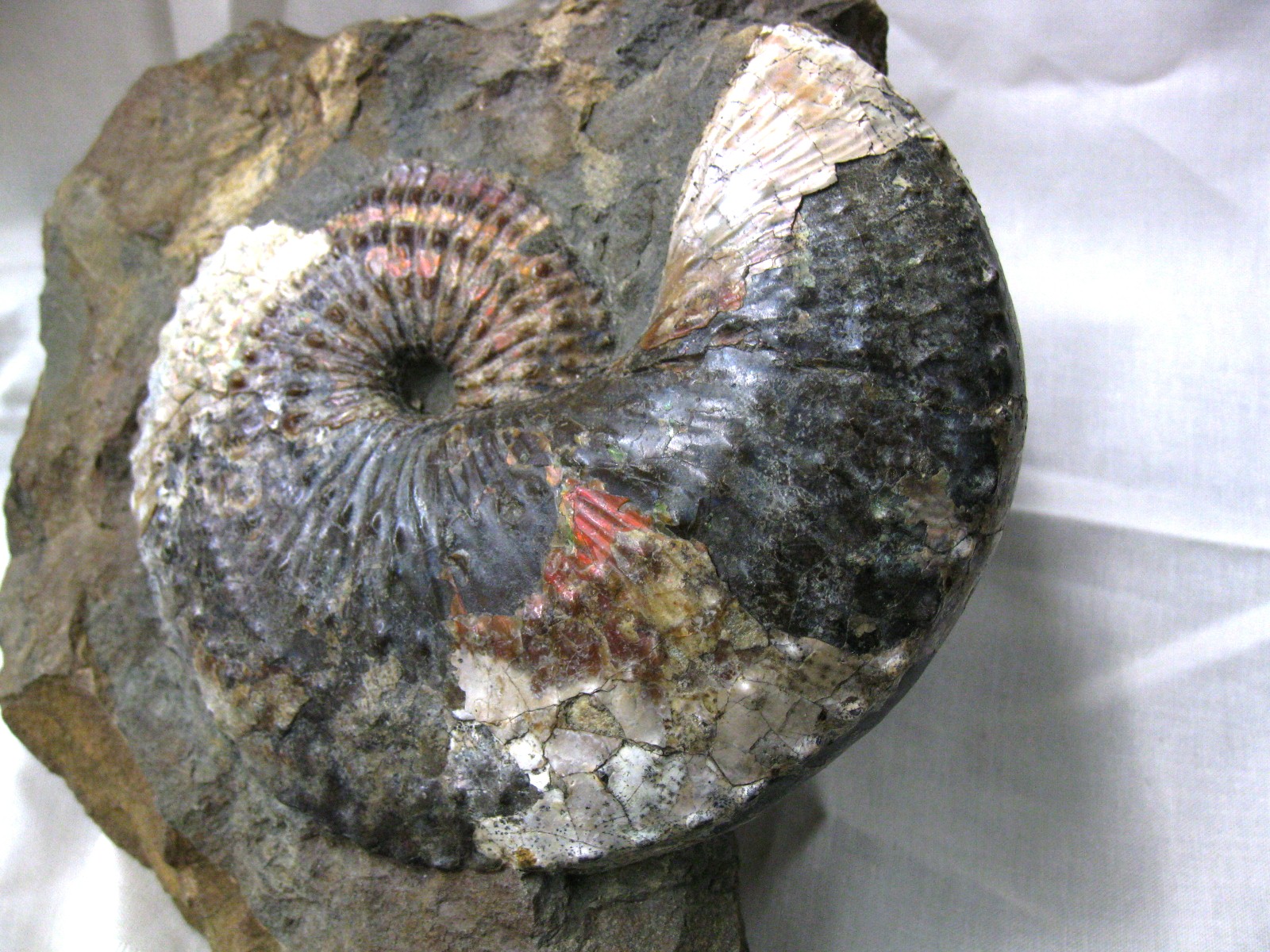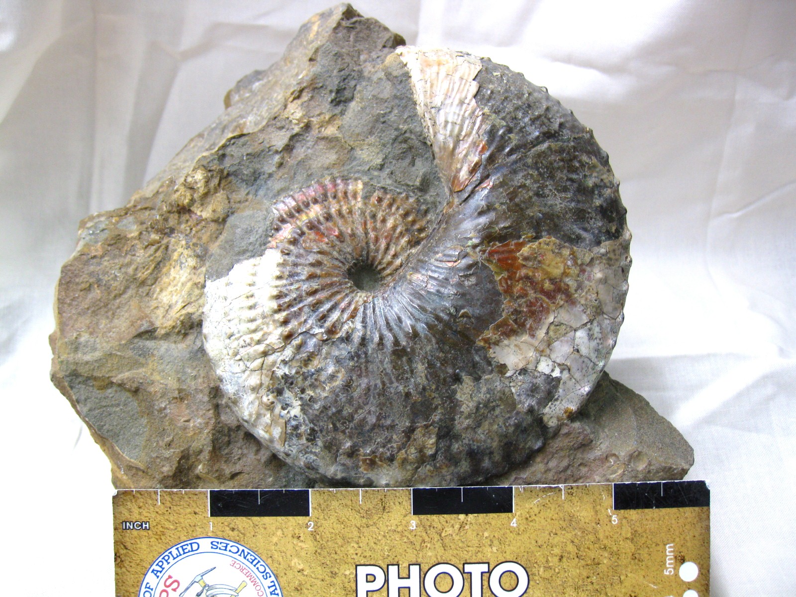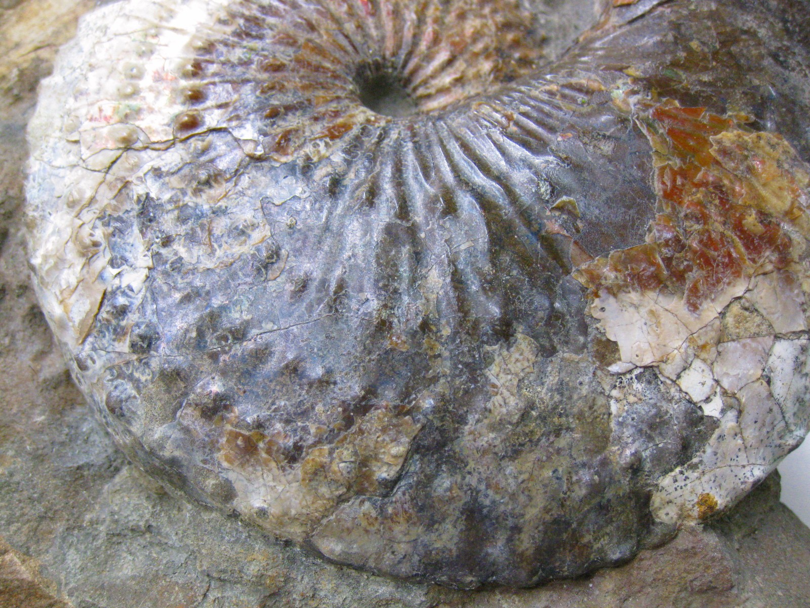 - This a very nice specimen that retains most of it’s original shell. Areas of White, Browns, Reds and Yellows are present on this bumpy, ornate ammonite and some of the sutures are peeking through as well. The ammonite itself measures approx. 4 15/16″ wide. It is still embedded on the original matrix noduleVery nice!!