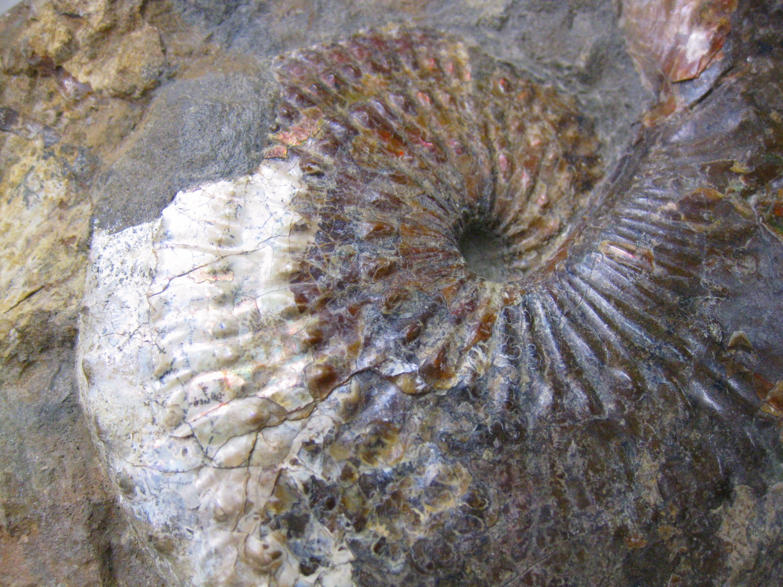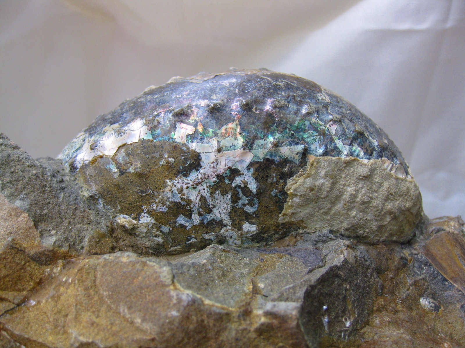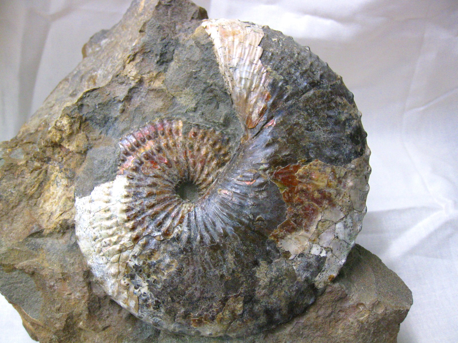 - This a very nice specimen that retains most of it’s original shell. Areas of White, Browns, Reds and Yellows are present on this bumpy, ornate ammonite and some of the sutures are peeking through as well. The ammonite itself measures approx. 4 15/16″ wide. It is still embedded on the original matrix noduleVery nice!!