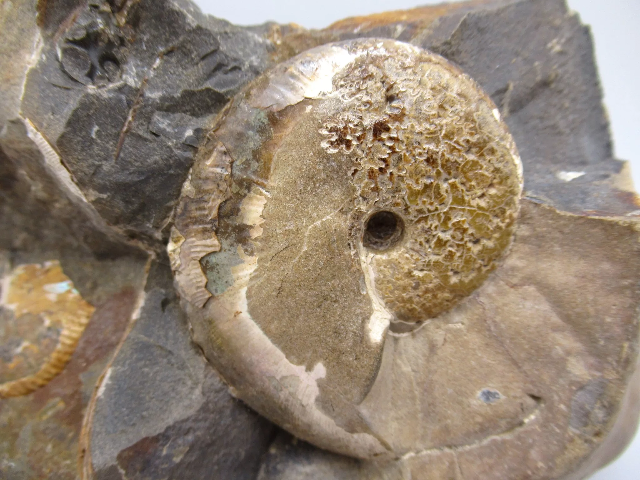 Ammonites belong to the Mollusca phylum in a class known as cephalopods – “head-footed” creatures such as octopus and squid. They swam in ancient oceans from the Devonian Period, about 400 million years ago, to their extinction along with the dinosaurs in the Cretaceous Period, 65 million years ago.