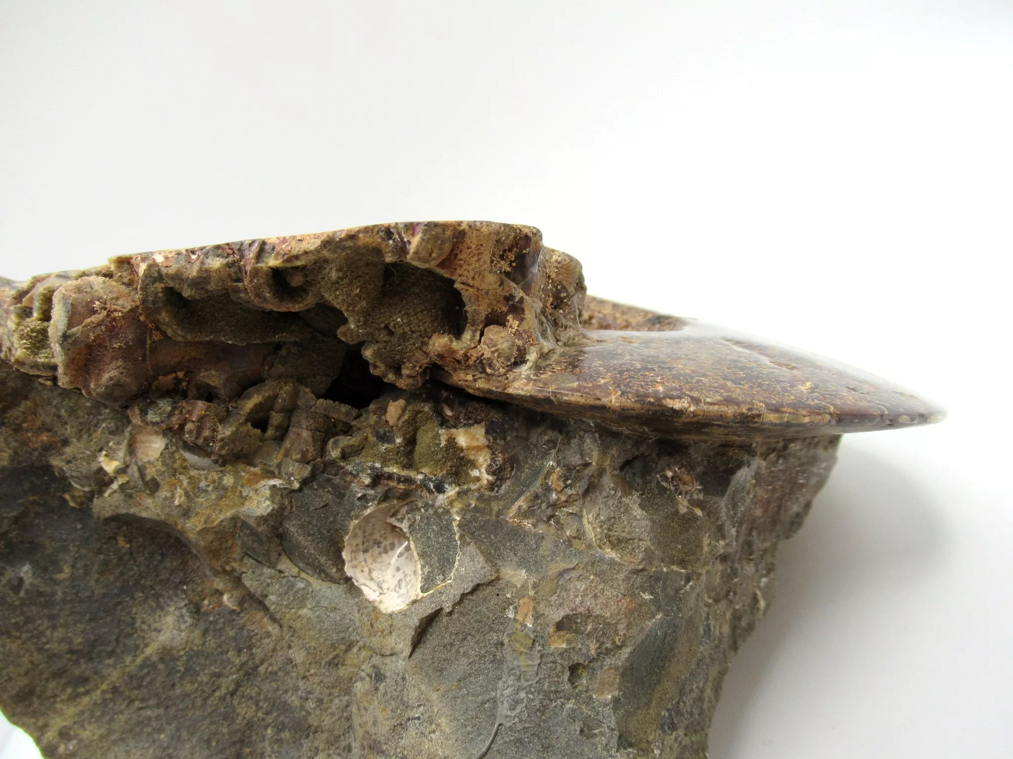Ammonites belong to the Mollusca phylum in a class known as cephalopods – “head-footed” creatures such as octopus and squid. They swam in ancient oceans from the Devonian Period, about 400 million years ago, to their extinction along with the dinosaurs in the Cretaceous Period, 65 million years ago.