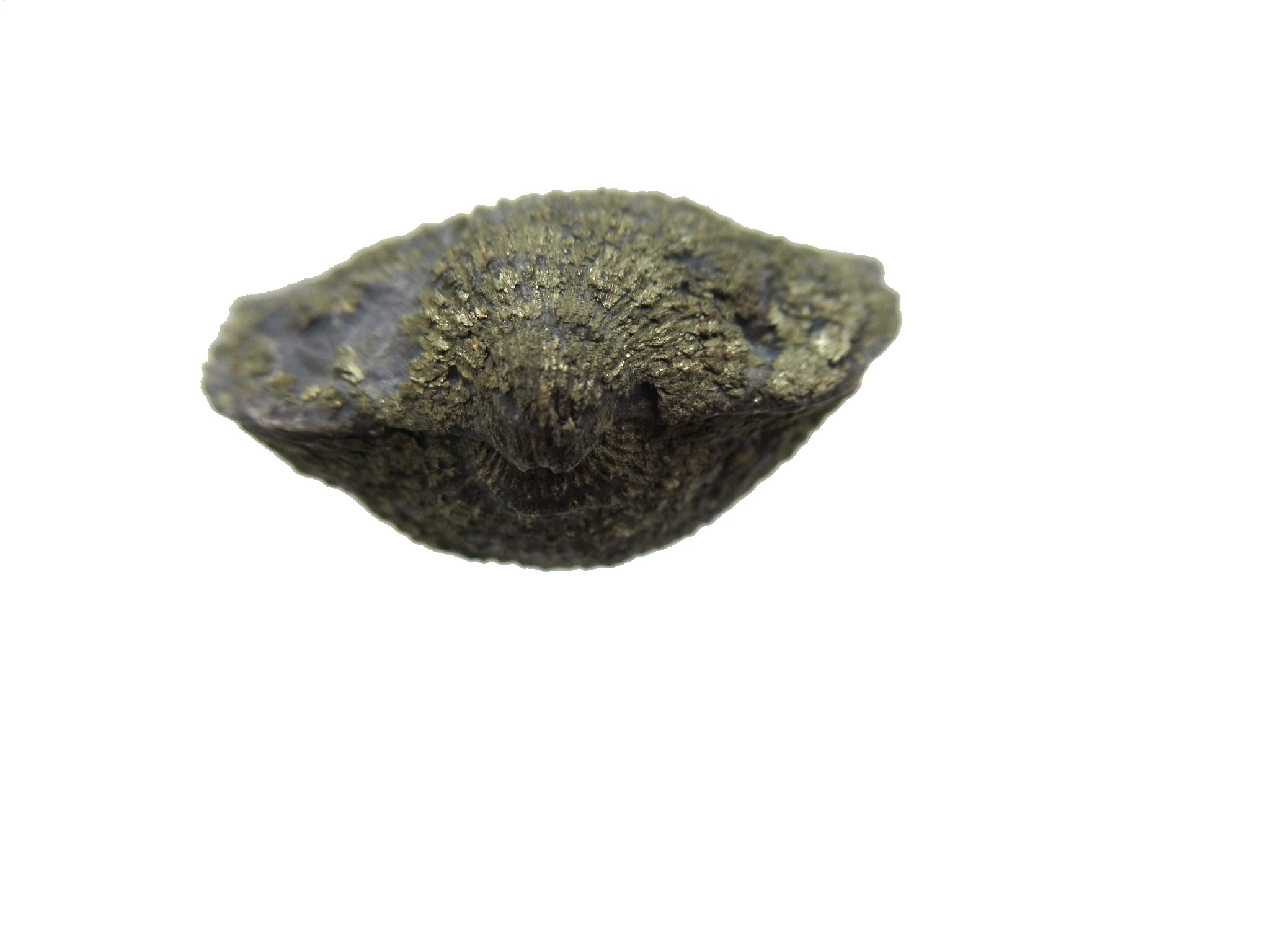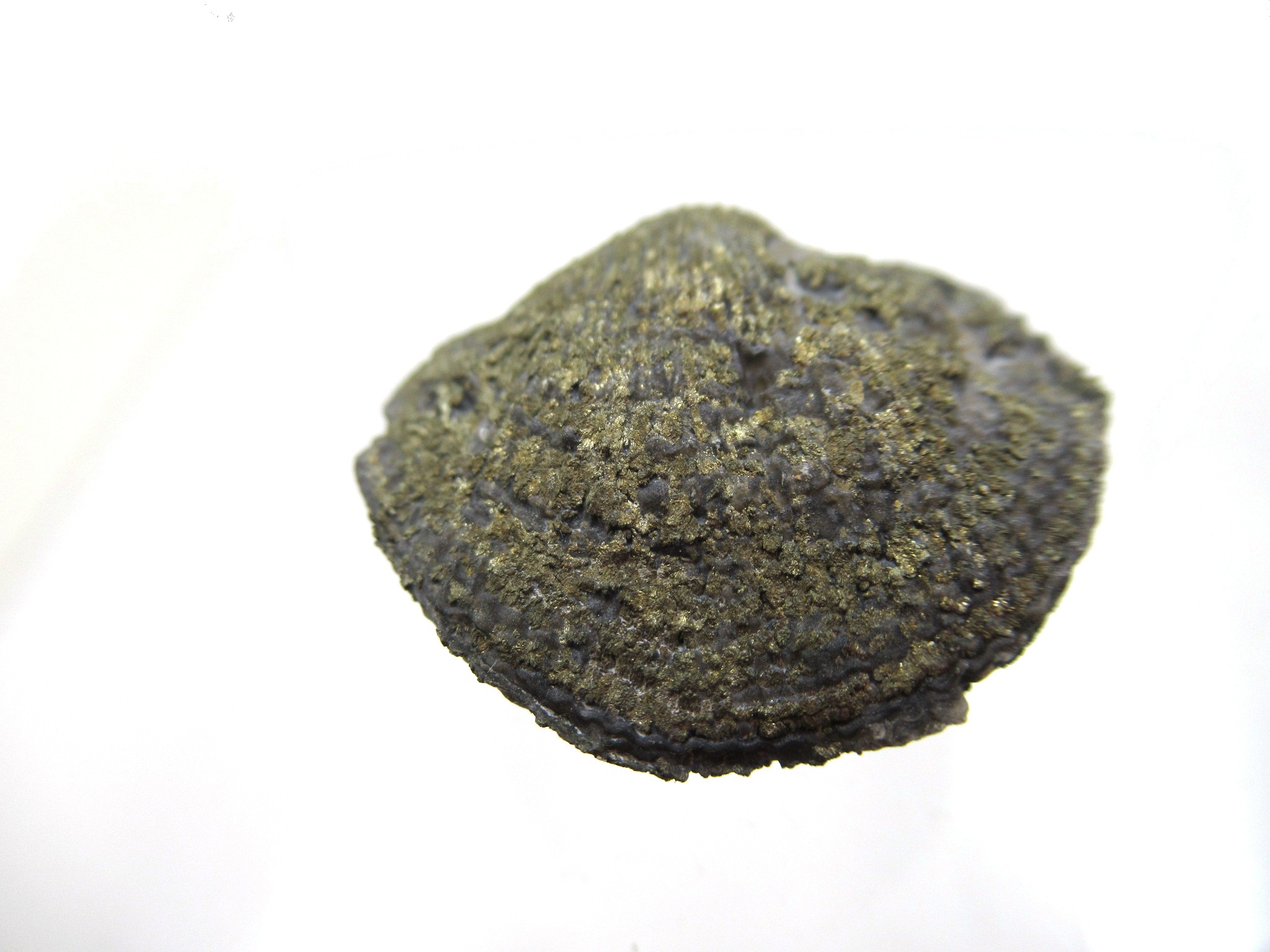 How did these Brachiopods become pyritized? After the brachiopod was buried in the silt that would become limestone, but probably before lithification or being turned into stone, ground water containing iron sulfide (in solution) progressively replaced the original shell material with fool’s gold (pyrite).