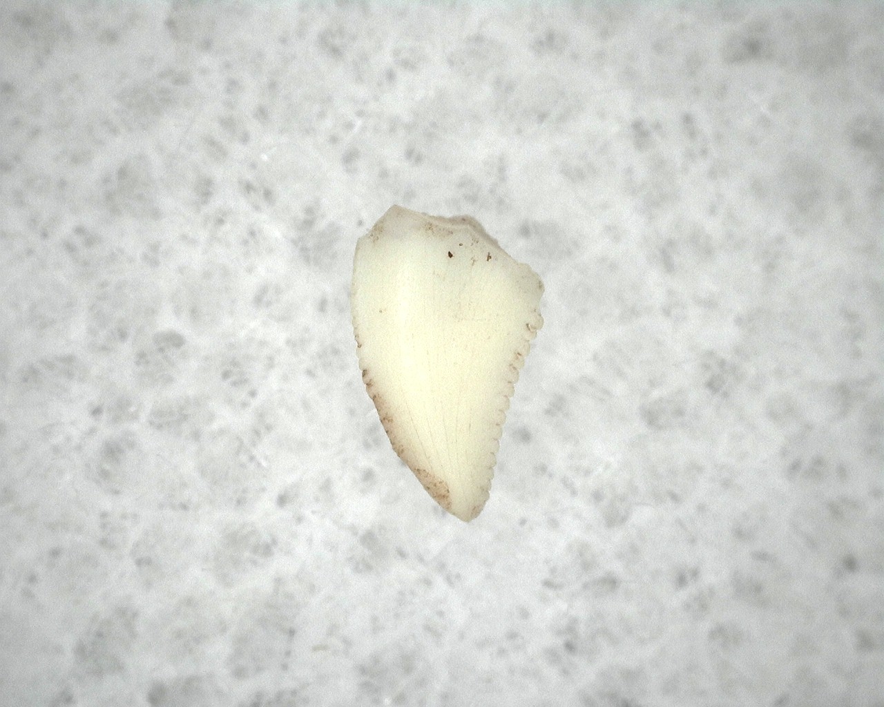 These serrated carnivore teeth are almost fresh looking, pearly white, & the little dinosaurs that possessed them have been referred to as “chickens from hell”