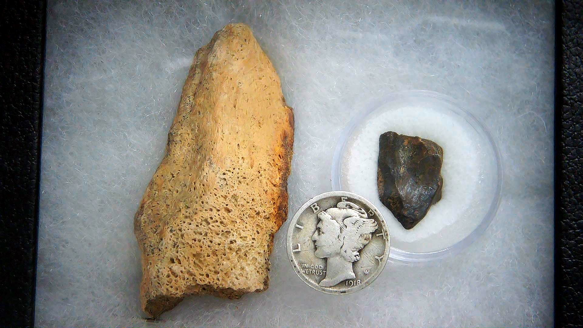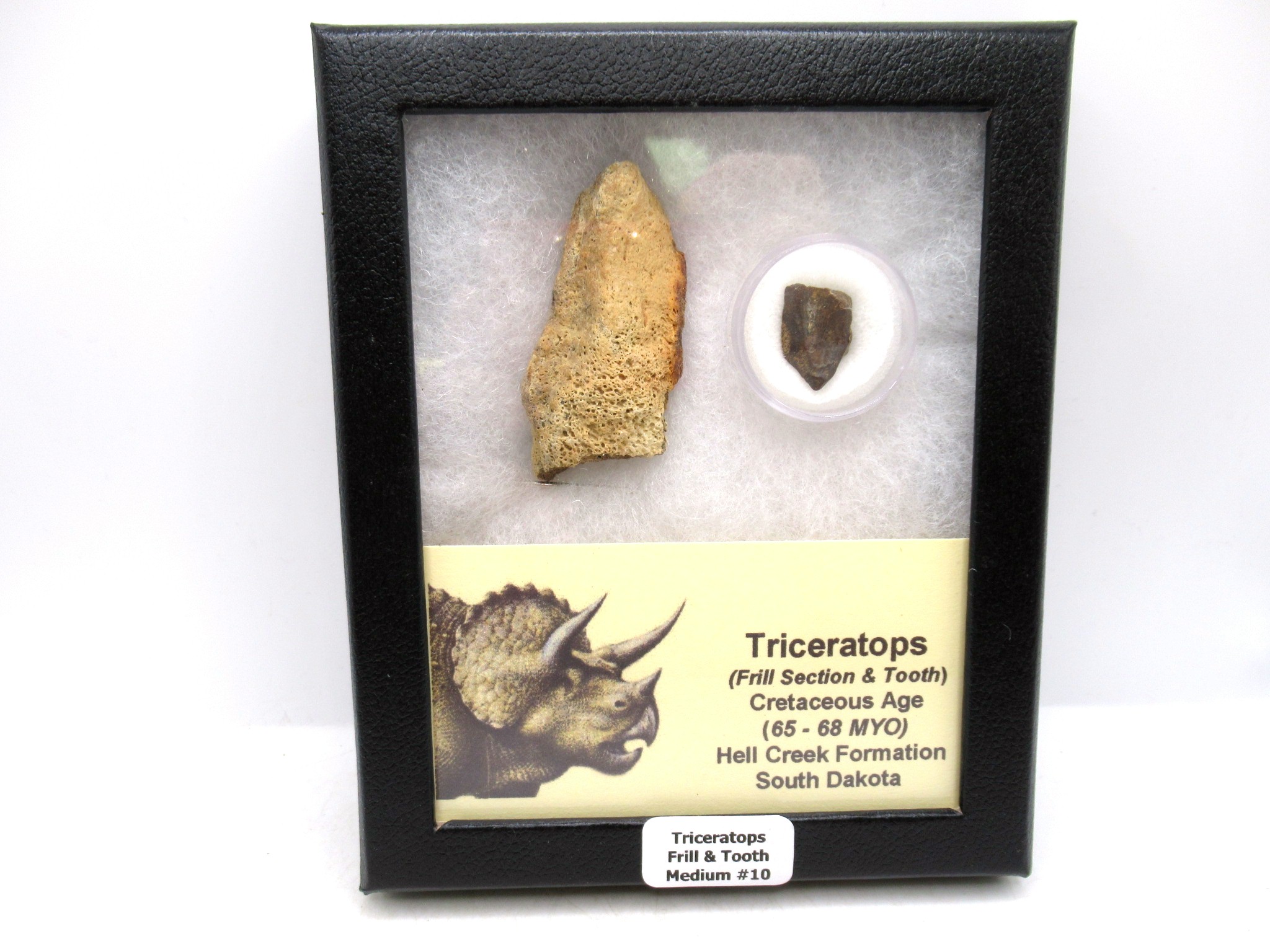 • This display set consists of 1 nice piece of Triceratops Frill (Head Shield) in addition to 1 nice Triceratops Shed Tooth