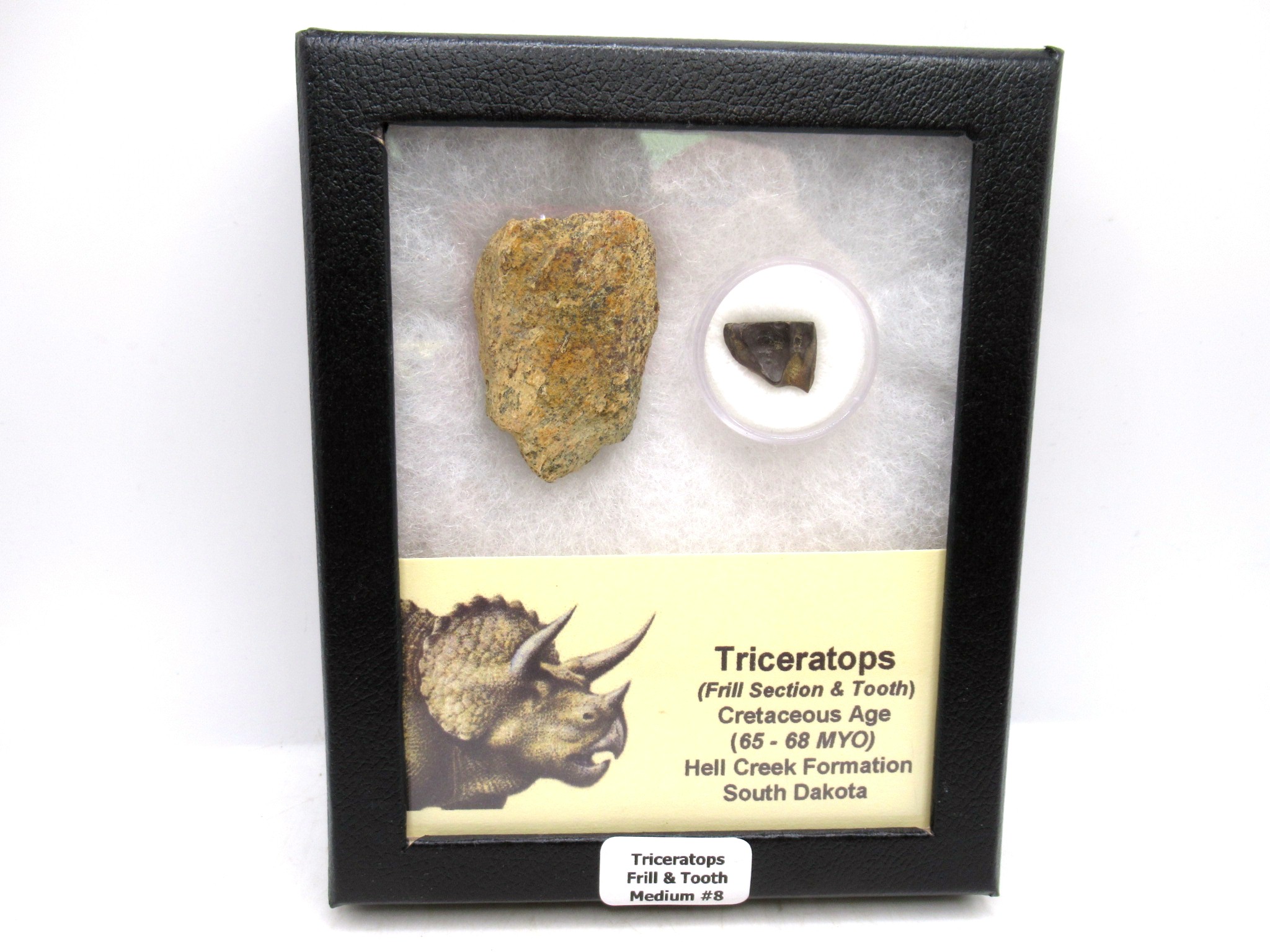 • This display set consists of 1 nice piece of Triceratops Frill (Head Shield) in addition to 1 nice Triceratops Shed Tooth
