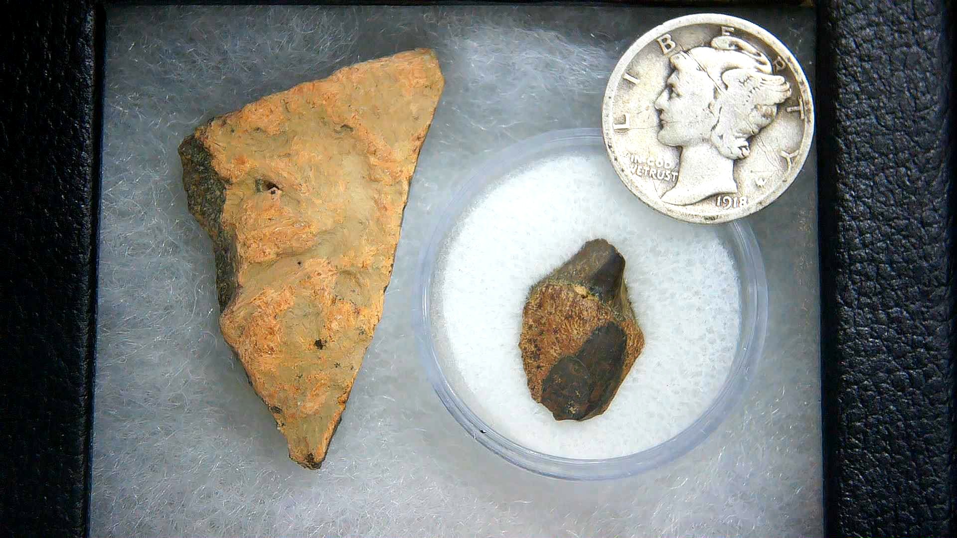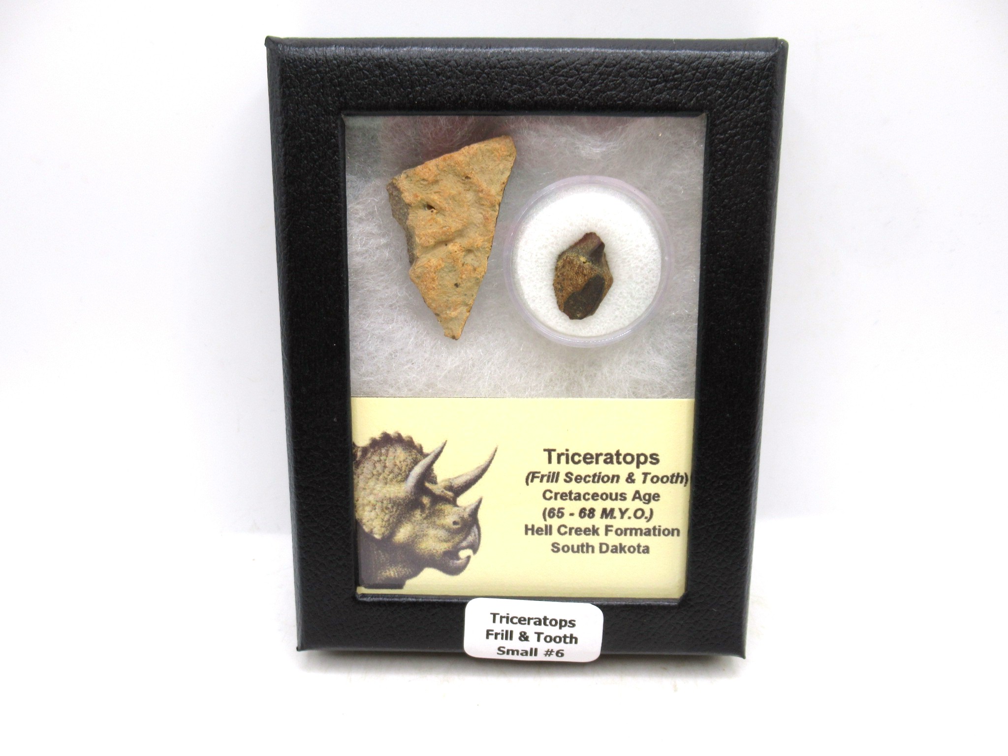 • This display set consists of 1 nice piece of Triceratops Frill (Head Shield) in addition to 1 nice Triceratops Shed Tooth