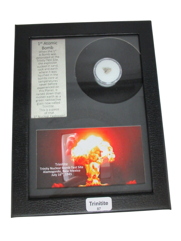 • The Trinitite Atomic Bomb Glass Piece is housed in the 1.25″ Gem Jar inside of the Riker Mount