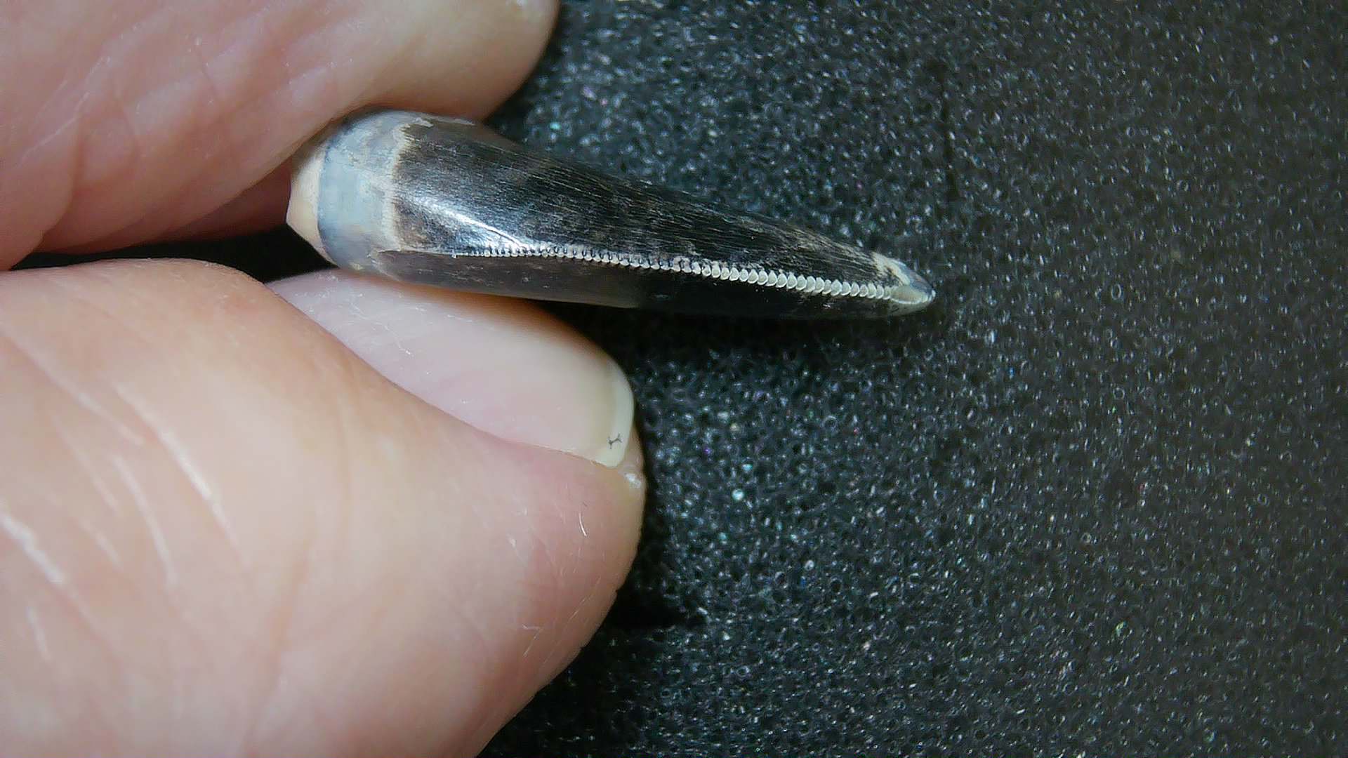 - This tooth measures .78″ long as well as .41″ wide. In addition, it has nice serrations, enamel and tip as well. it will come with an ID Label as well. Finally, 100% Guaranteed Genuine