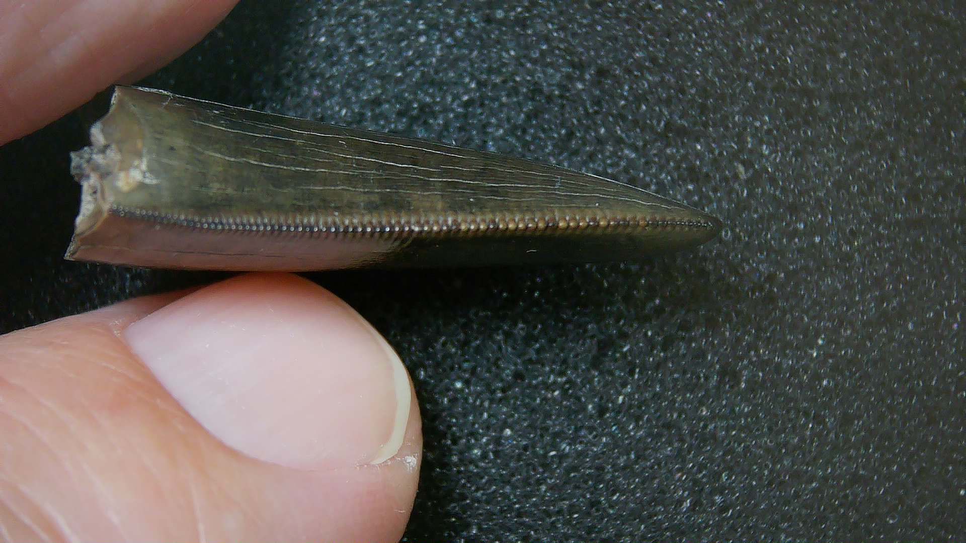 - This tooth measures 1.02″ long as well as .60″ wide. In addition, it has nice serrations, enamel and tip as well. it will come with an ID Label as well. Finally, 100% Guaranteed Genuine