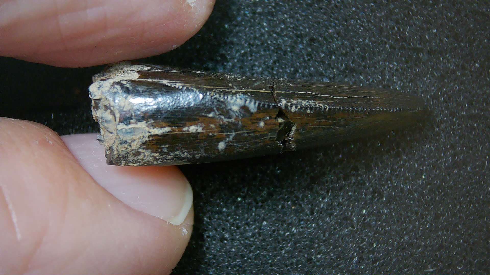 - This tooth measures 1.09″ long as well as .48″ wide. In addition, it has nice serrations, enamel and tip as well. (Repaired as shown in Photos) it will come with an ID Label as well. Finally, 100% Guaranteed Genuine