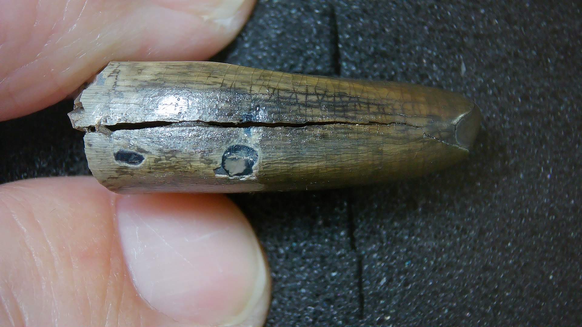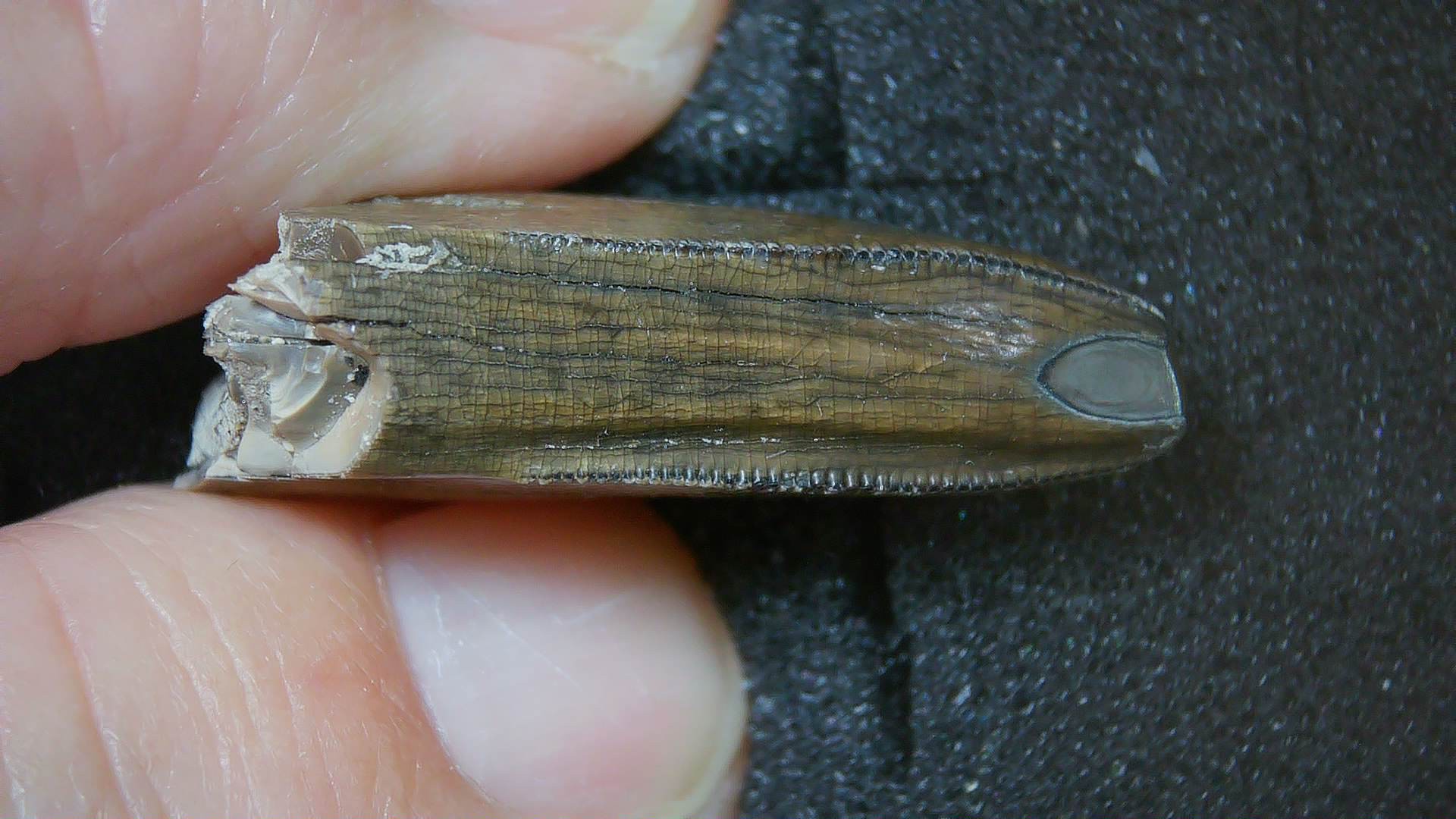 - This tooth measures 1.08″ long as well as .61″ wide. In addition, it has nice serrations, enamel and tip as well. Hydration Cracks Present, it will come with an ID Label as well. Finally, 100% Guaranteed Genuine