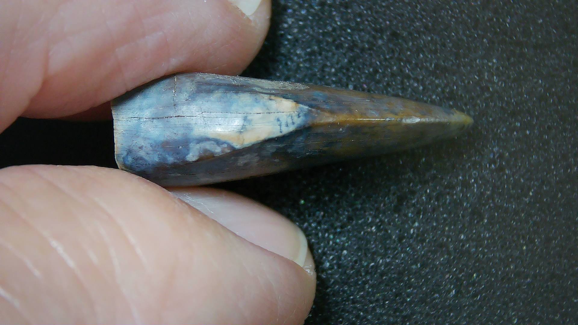 - This tooth measures .99″ long as well as .47″ wide. In addition, it has nice serrations, enamel and tip as well. it will come with an ID Label as well. Finally, 100% Guaranteed Genuine
