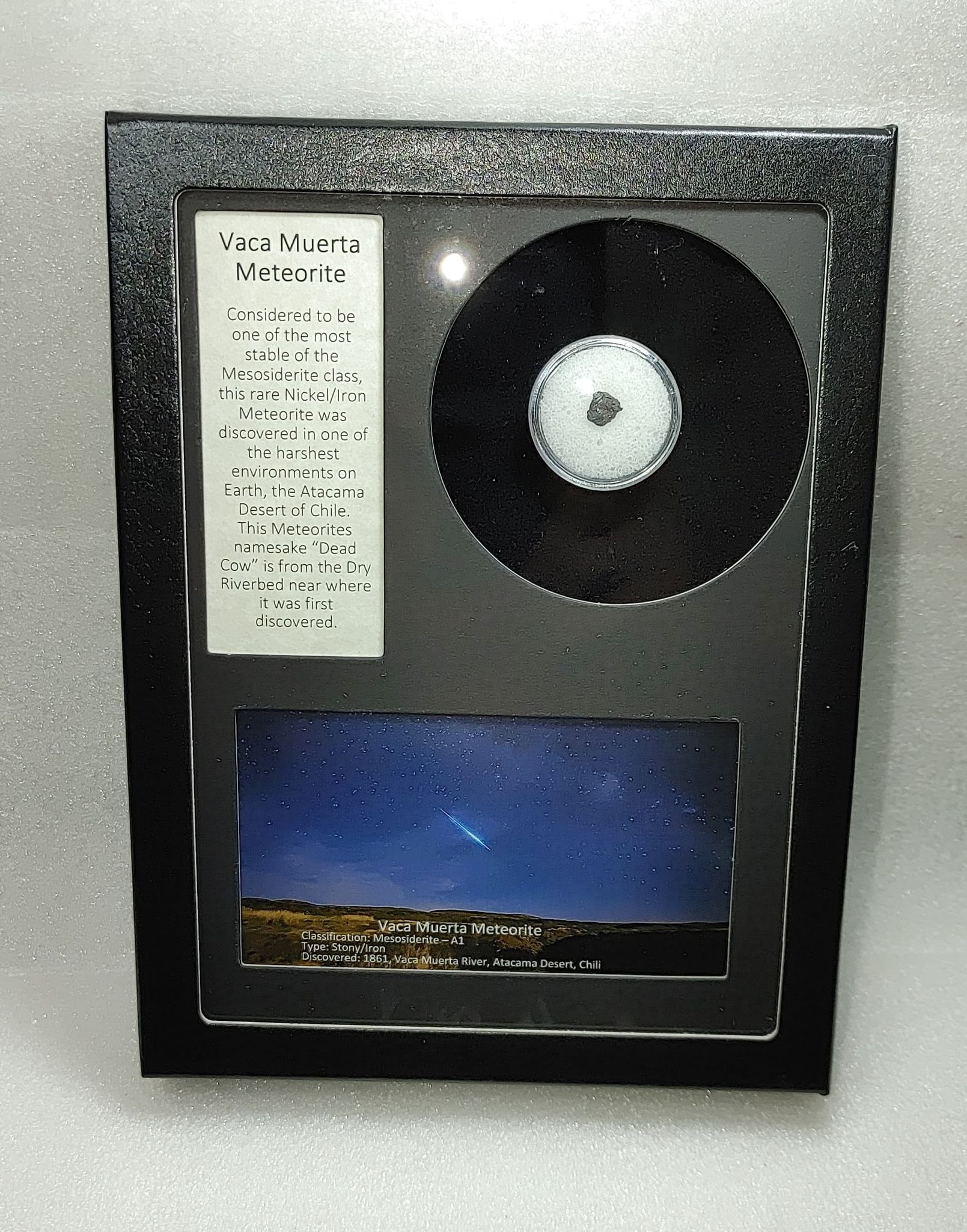 Vaca Muerta Meterta Meteorite Is considered to be one of the most stable of the Mesosiderite class, this rare Nickel/ Iron Meteorite was discovered in one of the harshest environments on Earth, the Atacama Desert of Chile. This Meteorites namesake “Dead Cow” is from the Dry Riverbed near where it was first discovered.