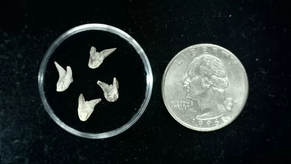 • This is a nice group of excellent quality shark teeth.  This group comes in the 1.25″ gem jar as shown.